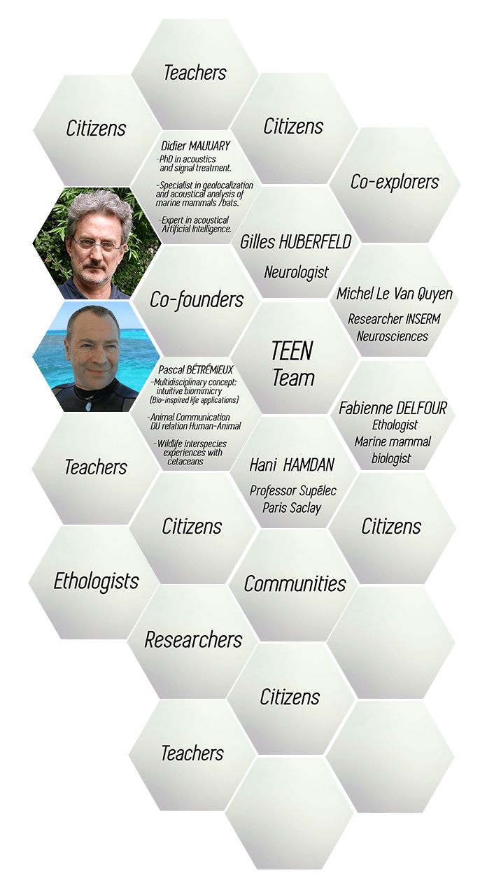 « TEEN » partners represent – with the two co-founders – the key scientific fields working in synergy: Technologists, Ecologists, Ethologists and Neurologists.